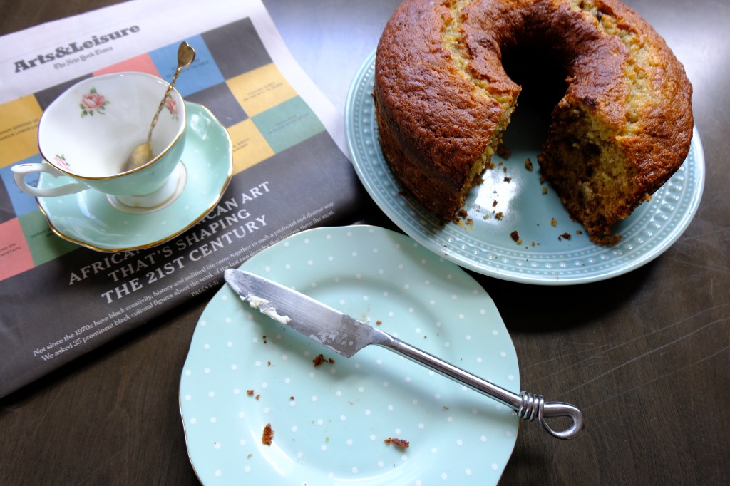 Preheat your oven to 325 F and prepare your bundt pan by coating with cooking spray or greasing then coating in access flour. I do not have a bundt pan, so I used an angel cake pan. You can alternatively use two 8 x 4 loaf pans!